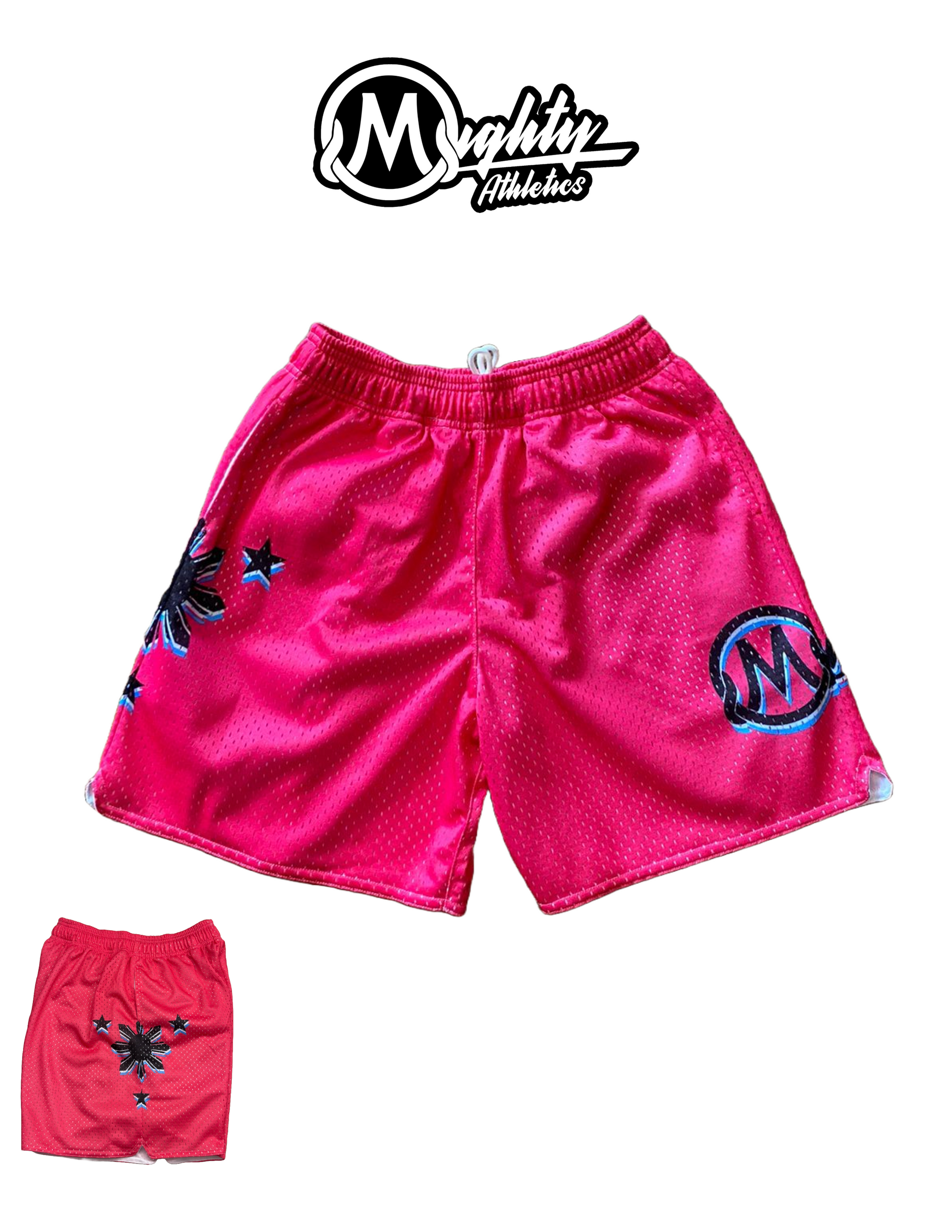 These vibrant pink sports shorts are designed to make a bold statement. Featuring a sleek black sunburst design with star accents on one side and the Mighty Athletics logo on the other, these breathable mesh shorts deliver style and performance. Perfect for those who love a striking look on or off the court.